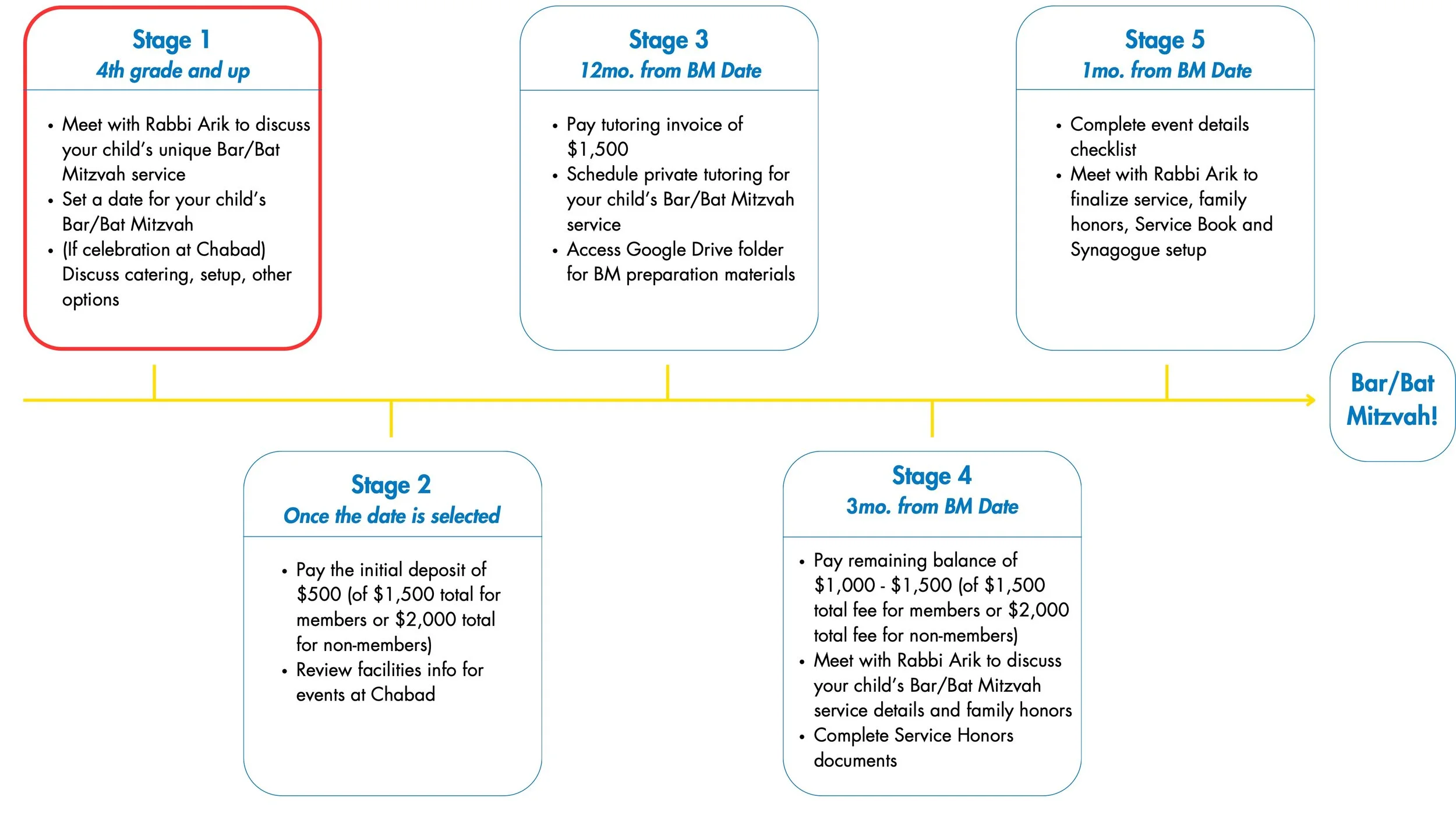 Schedule an appointment with Rabbi Arik: in this initial meeting you will discuss the whole Bar/Bat Mitzvah process at Chabad of Bedford, the importance of a Bar/Bat Mitzvah, and setting a date for your child’s event.